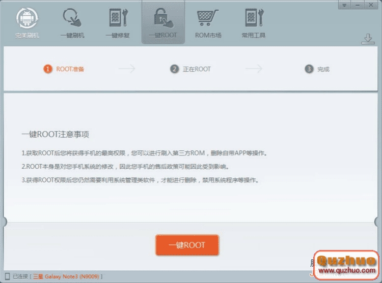 雙擊發動軟件,軟件成功銜接三星n9009,這時點擊頁面上方的“一鍵ROOT”,進入三星Galaxy note3(n9009)root頁面。對“一鍵ROOT注意事項”了解明白後立刻點擊“一鍵ROOT”,軟件開端三星note3 n9009完滿root!