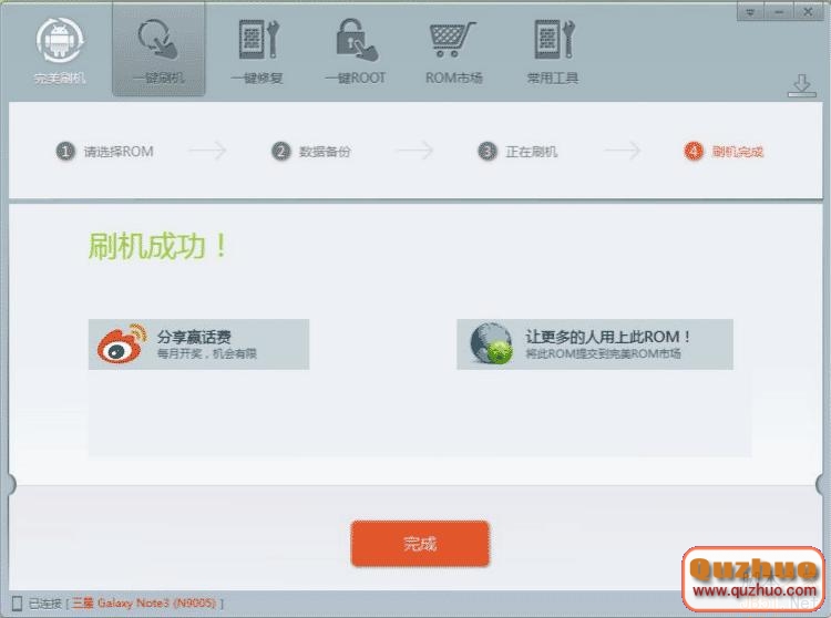 三星note3n9005刷機成功後,能夠跟機友們共享這個刷機包,點擊右側“讓更多人用上此ROM”, 就會跳轉到完滿ROM商場,在那裡填寫ROM的信息就行!