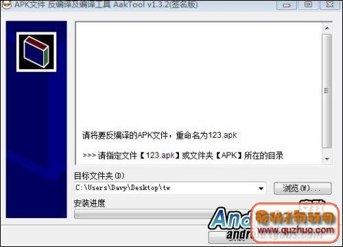 3.下載貼子附件中的反編譯工具v132 簽名版,解壓至隨意文件夾。運行 APK反編譯工具,點擊浏覽,選擇你剛才放置123.apk 的文件夾(此文件夾名稱必須為英語或數字,不能是漢語!),然後點擊安裝。