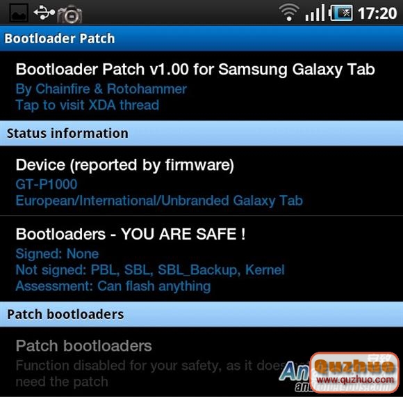 第三行的signed信息表明您的p1000是鎖定了bootloader的,只能刷寫入經過認證的官方固件.這時我們只需要點擊第四行的patchbootloaders,重啟後變會發現第三行已經顯示"canflashanything"了.搞定!前期准備工作完成!