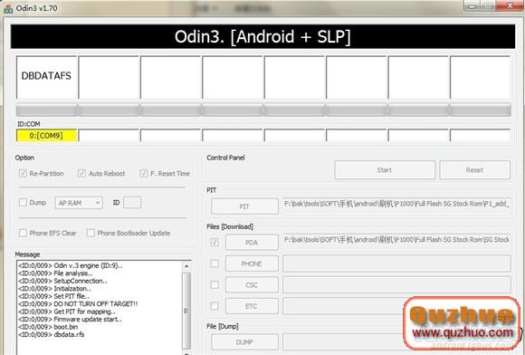 第三步,裝好adb驅動,手機完全關機.按住音量下+電源進入挖煤模式.接入數據線.手機端的工作完畢,打開odin3軟件,正確安裝驅動的手機會在軟件中識別出一個com口(黃色高亮顯示),把re-partition,auto-reboot,f.reset.time都勾選上,pit選中下載回來的rom的專用pit,pda懸賞下載回來的rom的專用tar,然後按下start!享受期盼吧!經過三分鐘左右的刷寫時間,p1000會自動重啟進入recovery模式快速進行額外的刷寫,然後手機重啟,這時已經是一台全新的p1000在等著你啦!