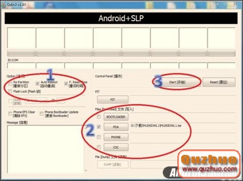 5、在Odin界面上勾選“Auto reboot”和“F. Reset Time”,確認其它的都沒勾。點“PDA”按鈕,選擇要刷寫的Firmware文件。