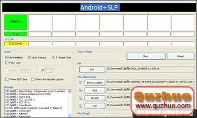 3、啟動Odin 程序,並將手機連接至www.shuleba.com電腦,連接後,Odin 界面的ID:com下方顯示黃底和端口號。