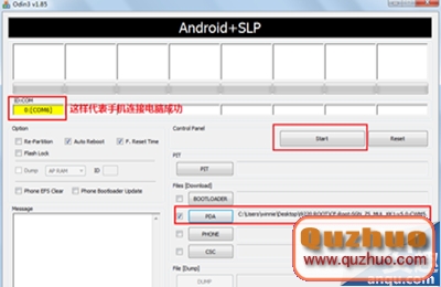 2、完成上面的操作之後,手機通過USB 連接www.shuleba.com電腦,雙擊打開“Odin3 v1.85.exe 刷機工具,在PDA選項裡把“i9220 recovery.tar”選上,其他都不用動!然後點擊“Start”,開始刷入recovery機!