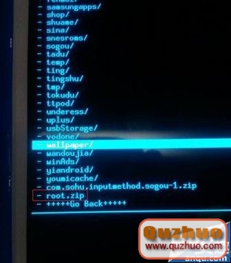 3、選取ROOT.zip(手機音量+—鍵選擇光標移動,按手機home鍵或手機電源鍵確認),如下圖: