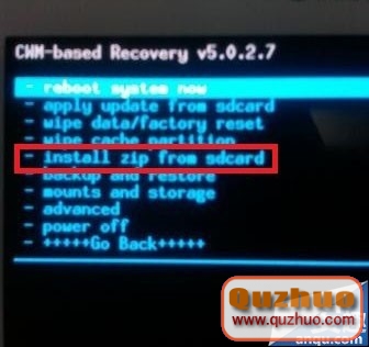 2、選擇"install zip from sdcard",如果你把文件放在外置SD卡,那麼選擇choose zip from sdcard。如果你把文件放進內置內存,那麼選擇choose zip from internal sdcard(手機音量+—鍵選擇光標移動,按手機home鍵或手機電源鍵確認)