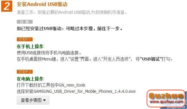 第二步,安裝三星i9250 Android USB驅動:將手機通過USB線連接www.shuleba.com電腦,然後按手機MENU鍵,進入設置界面,進入開發人員選項,選擇USB調試。打開下載好的工具包,安裝。