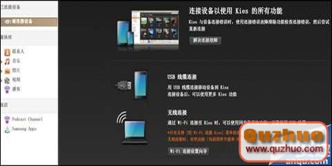 3、另外一個選項是無線連接,無線連接是通過Wifi連接至Kies,可以使用同步或者其他功能,無需使用USB數據線。但是用無線Wifi有個不好 的地方,就是只有支持(經Wifi 連接Kies)菜單的設備才能使用Wifi連接,無線連接時,有些功能(包括固件升級和DRM的內容傳輸)是無法使用的。所以這裡我們使用USB數據線來 進行連接。