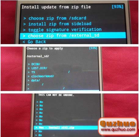 3、完成後我們在選擇【install zip】,然後這裡需要注意,如果是將ZIP格式卡刷包放入手機自帶內存就選擇【choose zip from /sdcard】,然後找到事先放在手機或者外置SD卡上的刷機包。
