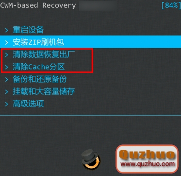 2、在Recovery模式下,我們使用音量鍵選擇,電源鍵確認,依次執行【清除數據】和【清除緩存Cache】兩項。這也是我們俗稱的雙清!