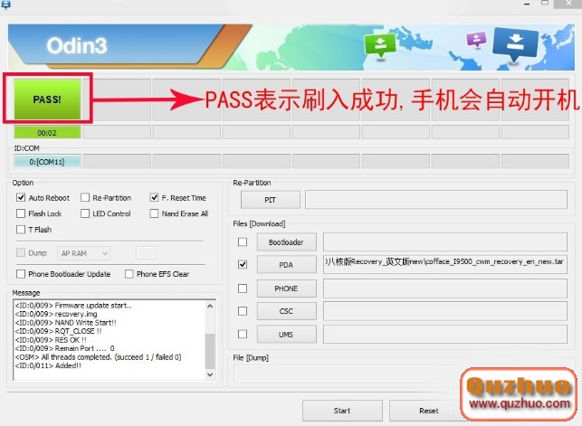 2.進入刷機模式以後,手機通過數據線連接www.shuleba.com電腦(使用台式機的朋友應將數據線連接在主機箱後面的USB接口),打開ODIN刷機工具,在【PDA】處選擇我們事先下載的第三方Recovery(注意是tar格式的喔~),等待COM端口出現藍色條,說明手機連接成功。點擊開始刷機,軟件自動刷入Recovery,完成後手機自動重啟。