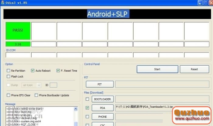 3..打開Odin3 v1.85.exe,點擊PDA選擇解壓出來的xxxxx.3.tar或者md5。(固件包)