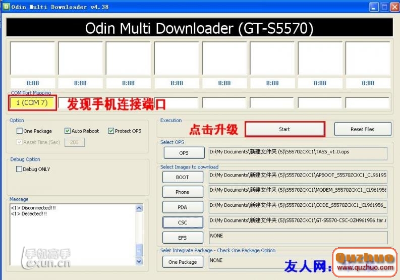 將手機連接www.shuleba.com電腦,成功連接後會顯示連接端口,我這裡顯示的是COM 7,然後點擊Strat選項進行升級。