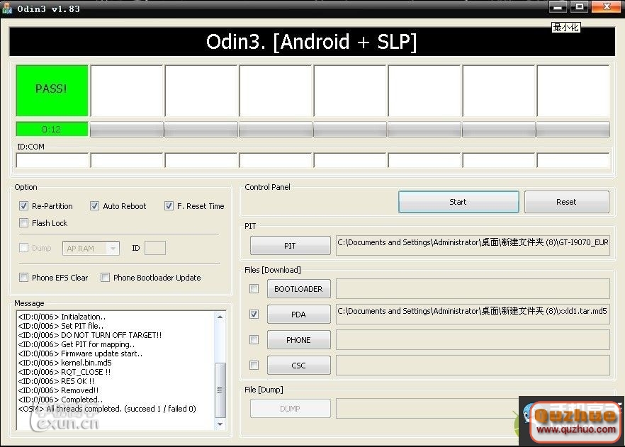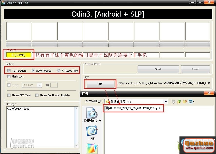 4,連上數據線,去解壓出來的文件裡邊找到Odin3 v1.83.exe文件並雙擊打開,並按照下圖進行文件(所有的文件都在開始下載的壓縮包裡邊)的選擇!