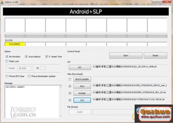 2.在www.shuleba.com電腦上打開解壓好的N7000ZSKJ6文件夾中odin3v1.85刷機軟件,此時軟件會自動識別你的手機:左上角ID:COM處顯示黃色,