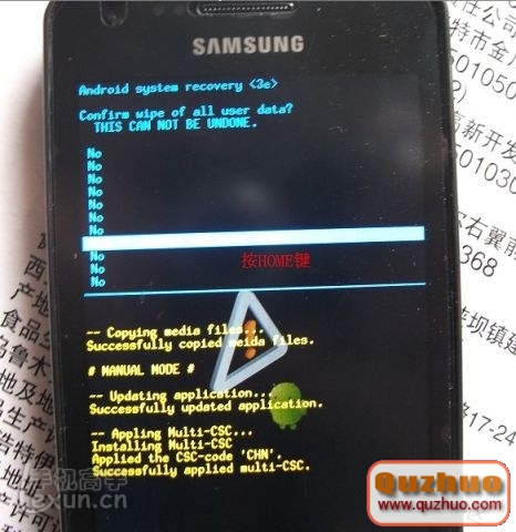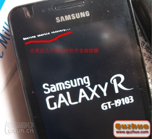 3.看到這個第一個畫面,立即把 音量鍵上 和 home鍵同時按下,1-2秒時,注意顯示屏上面會出現一行小字【簡直是一閃而過】 【recovery。。。小機器人】,這個時候要立刻吧所有按鍵松開, 否則很快就會黑屏,松開所有按鍵以後就進入 recovery,