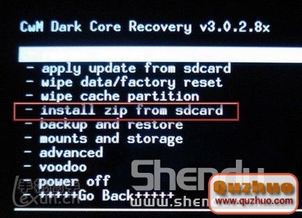 再用音量上下鍵選擇“install zip from sdcard”。見紅色方框。然後按電源鍵確認。