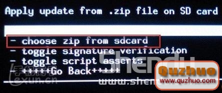 2、進入下一個界面:用音量上下鍵選取“choose zip from sdcard”。見紅色方框。然後按電源鍵確認。