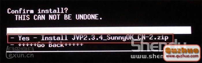 4、進入下一個界面:用音量上下鍵選取“Yes – Install xxxxxxx.zip”來確認刷這個文件。見紅色方框。然後按電源鍵確認。