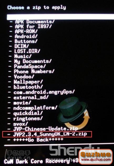 注意:在第一步裡我們已經把刷機包文件拷貝到了SD卡的根目錄。所以你現在應該看到這個文件名。用音量上下鍵選取“刷機包的文件”。然後按電源鍵確認。