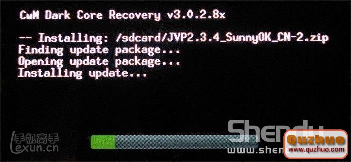 5、進入下一個界面。刷機開始。你會看到下列刷機進度信息和綠色進度條。