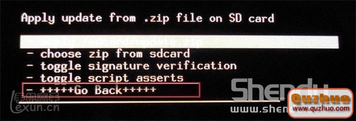 在屏幕的上半部出現下列信息。這與前面的第二個界面相同。現在要選取“+++++Go Back+++++”回到上一個(第一個)Recovery界面。按電源鍵確認。