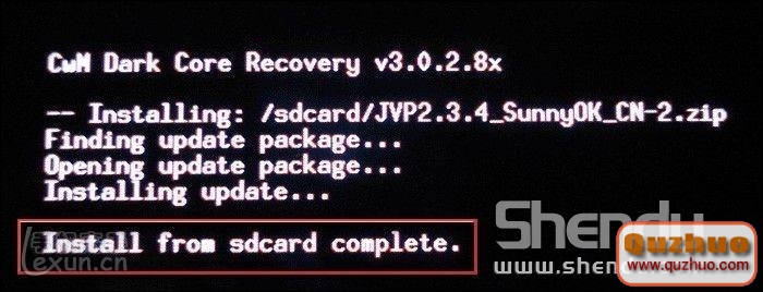 6、需要大約一分鐘時間,刷機結束,又回到Recovery模式。在屏幕下半部顯示下列圖像。你會看到刷機結束通知:“Install from sdcard complete.”,告訴你:從SD卡的安裝結束了。
