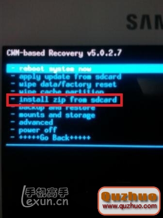 3、如果你把文件放在SD卡,那麼選擇choose zip from sdcard。如果你把文件放進內置內存,那麼選擇choose zip from internal sdcard
