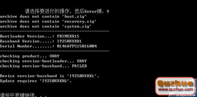 第五步,如果刷入的是官方包,首先會對你的三星手機bootloader,radio進行檢測,如果達不到刷機的要求,出現下圖提示: