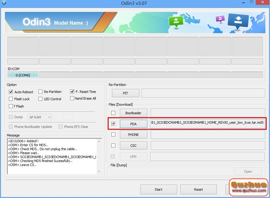 在www.shuleba.com電腦端打開Odin3後選擇PDA,並選擇壓縮包內的官方線刷包(SC03EOMAMB1_SC03EDCMAMB1_SC03EOMAMB1_HOME_REV00_user_low_true.tar.md5)