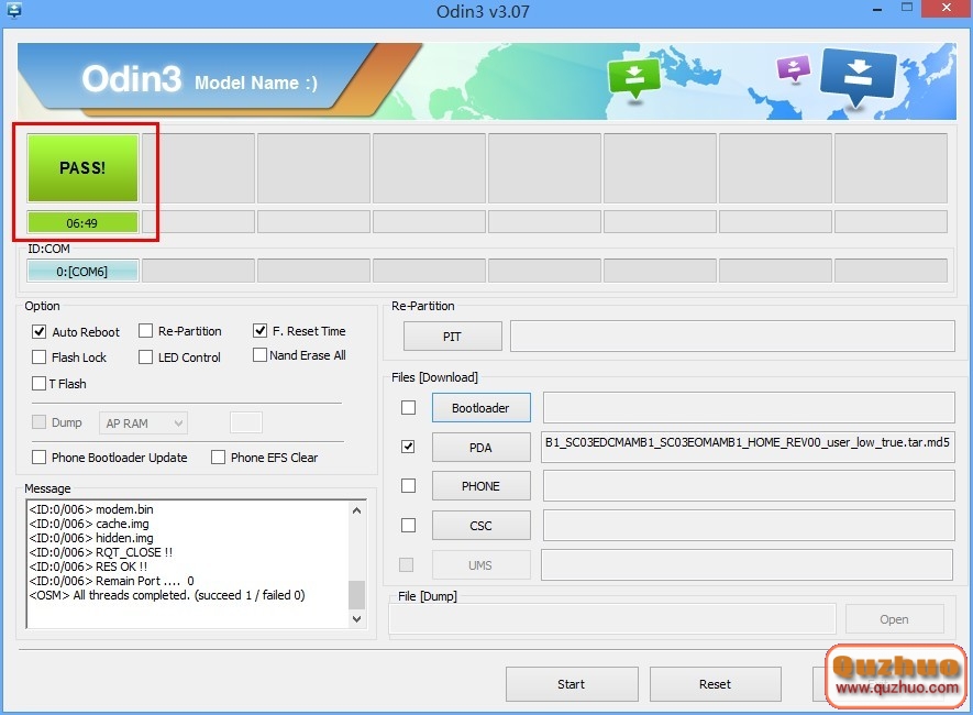 等待一小會兒,等待odin出現下圖中的PASS即表示刷機完成