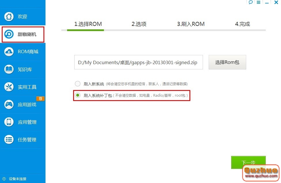 打開甜椒助手,一鍵刷機時,選擇“刷入系統補丁包”;