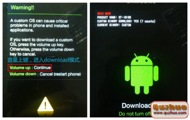 關機狀態下,同時按住Home鍵+音量下+電源鍵,出現提示,松手;按一下音量上確認進入download模式。