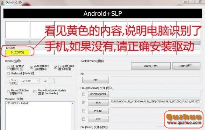 在www.shuleba.com電腦端打開Odin軟件,odin軟件會識別手機,識別成功後會在ID:COM處顯示黃色 如下圖