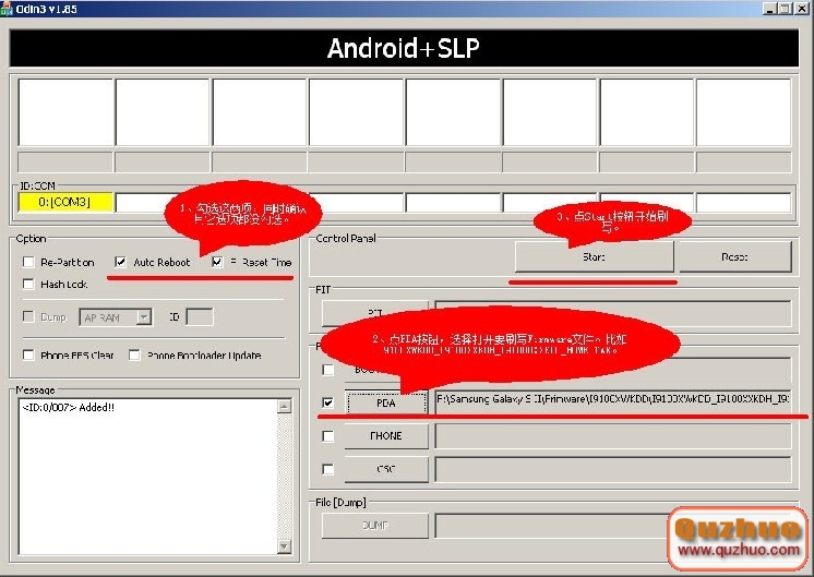 用Odin3刷寫:在Odin界面上勾選“Auto reboot”和“F. Reset Time”,確認其它的都沒勾。點“PDA”按鈕,選擇下載後解出來的I9100xxx.tar文件。