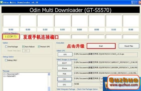 將手機連接www.shuleba.com電腦,成功連接後會顯示連接端口,我這裡顯示的是COM 7,然後點擊Strat選項進行升級。