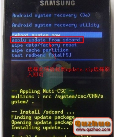 2、在進入官方recovery模式後選擇 apply update from sdcard ,找到update.zip 文件,選擇刷入即可。