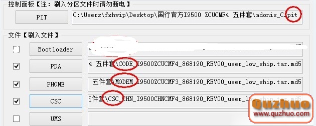4、在odin的pit處選擇後綴為*.pit的分區文件、PDA處選擇帶有CODE字樣的文件、PHONE處選擇帶有modem字樣的文件、CSC處選擇帶有“CSC”字樣的文件。在選擇pit文件之後重新分區的勾會自動勾選,請勿取消!(因為此固件沒有bootloader文件所以就不勾選)如圖: