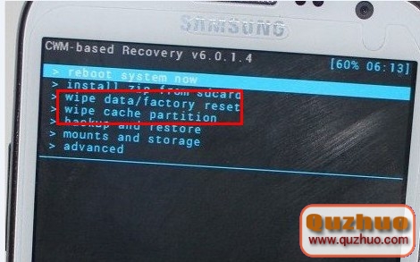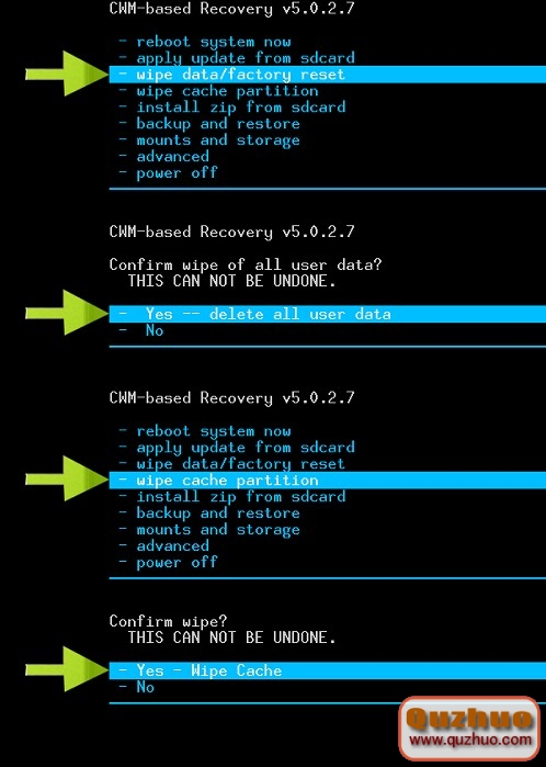 2、使用recovery執行雙清操作,即紅色方框內兩項,依次選擇。進入後選yes選項確認。此步驟為恢復出廠設置和清除緩存,其作用是為了安裝的新系統更加穩定,不會出現應用程序已停止的風險!