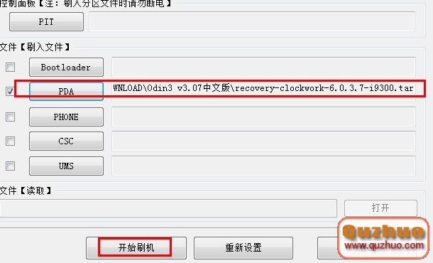 3、在PDA處選擇tar格式的 第三方recovery(recovery-clockwork-6.0.3.7-i9300.tar)點擊開始刷機即可,等待十秒左右手機自動重啟