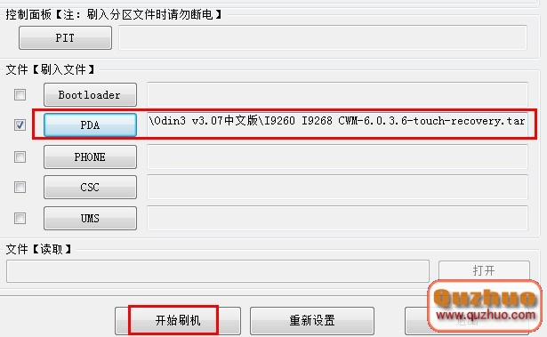 3、在 PDA處選擇 第三方recovery(I9268 CWM-6.0.3.6-touch-recovery.tar),點擊開始刷機。等待5-10秒,刷完後手機自動重啟。