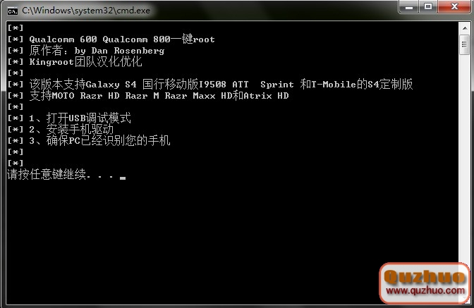 解壓所下載的一鍵解鎖工具,手機通過數據線連接www.shuleba.com電腦,等待驅動安裝成功後點擊解壓文件夾內的“run.bat”文件,按任意鍵開始,等待ROOT成功。