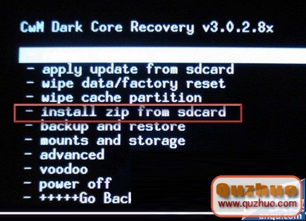 第一步,將手機關機,進入Recovery模式。 第二步,按音量上鍵,選擇install zip from sdcard,此時會出現紅色方框,電源鍵確認。 第三步