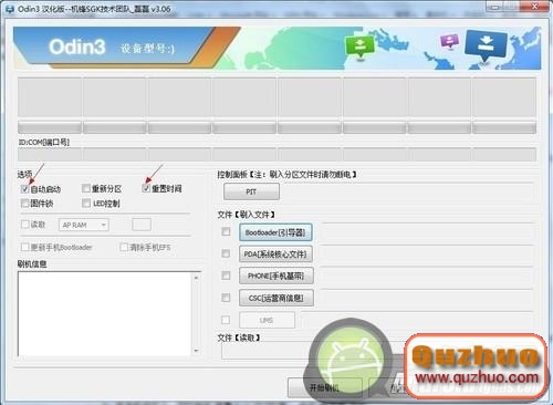 將手機關機,同時按住音量下鍵+Home鍵+電源鍵進入刷機界面,將手機和www.shuleba.com電腦連接,選擇安裝,然後啟動刷機工具,勾選“自動重啟、重置時間”。