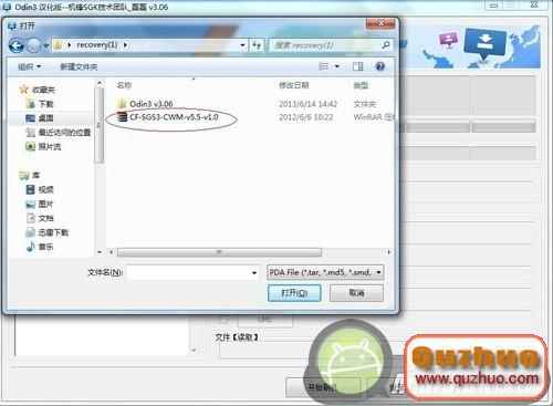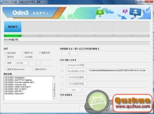 兩個選項以後點擊右側的PDA按鈕,選擇選擇SG3 CWM v5.5的Recovery程序,等個兩秒就可以完成刷機過程。