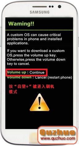 (4)同時按住手機的音量鍵(下)、HOME鍵、電源鍵,等到出現下圖時松開: