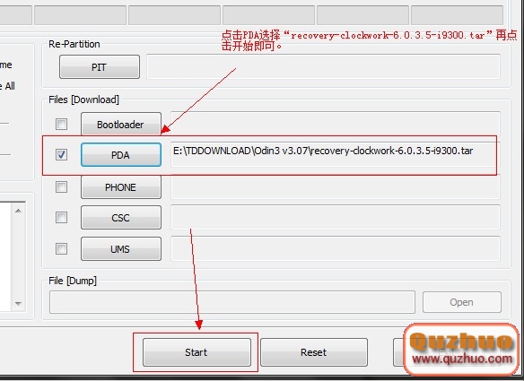 2、手機通過數據線連接www.shuleba.com電腦 ,打開Odin_v3.07,看見藍色COM:XX端口說明連接成功,在PDA處選擇“recovery-clockwork-6.0.3.5-i9300.tar”,點擊開始: