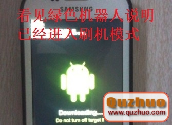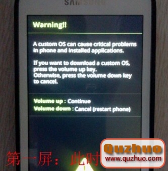 1、首先將手機關機,然後同時按住“音量下”鍵、“HOME鍵”、“電源鍵”,看見第一屏英語提示按“音量上”鍵繼續,進入刷機模式,如圖: