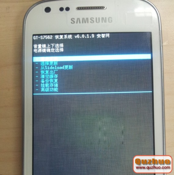 3、手機關機,把下載的zip格式的ROM固件放入內存卡,插入手機。同時按住“音量上”鍵、“HOME鍵”、“電源鍵”3-5秒,進入recovery模式: