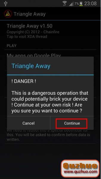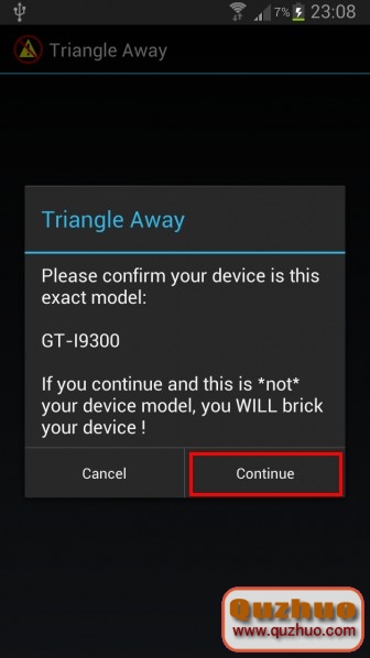 然後再次跳出警告,選擇“Continue”手機重啟: